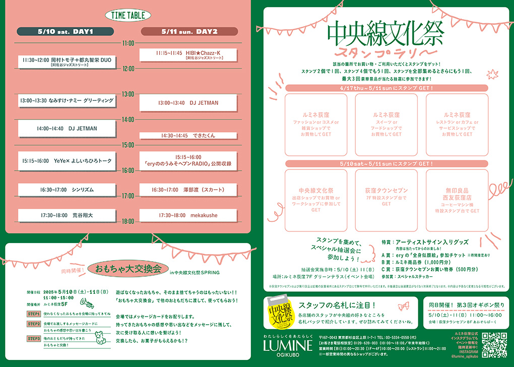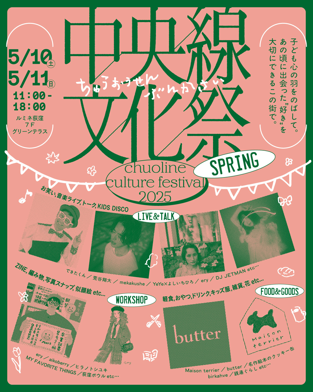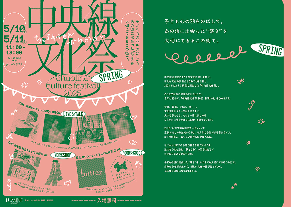 中央線文化祭2025 SPRING 2025.05 2025/5/10(土)・11(日) 『中央線文化祭2025 SPRING』 ルミネ荻窪で開催するイベントのロゴや、ポスター・リーフレットなどのグラフィックデザイン担当しました。 当日のFANZINEづくりワークショップ講師も担当。 一部企画ディレクション:me and you https://www.lumine.ne.jp/ogikubo Copyright © Kisamiyazaki inc.